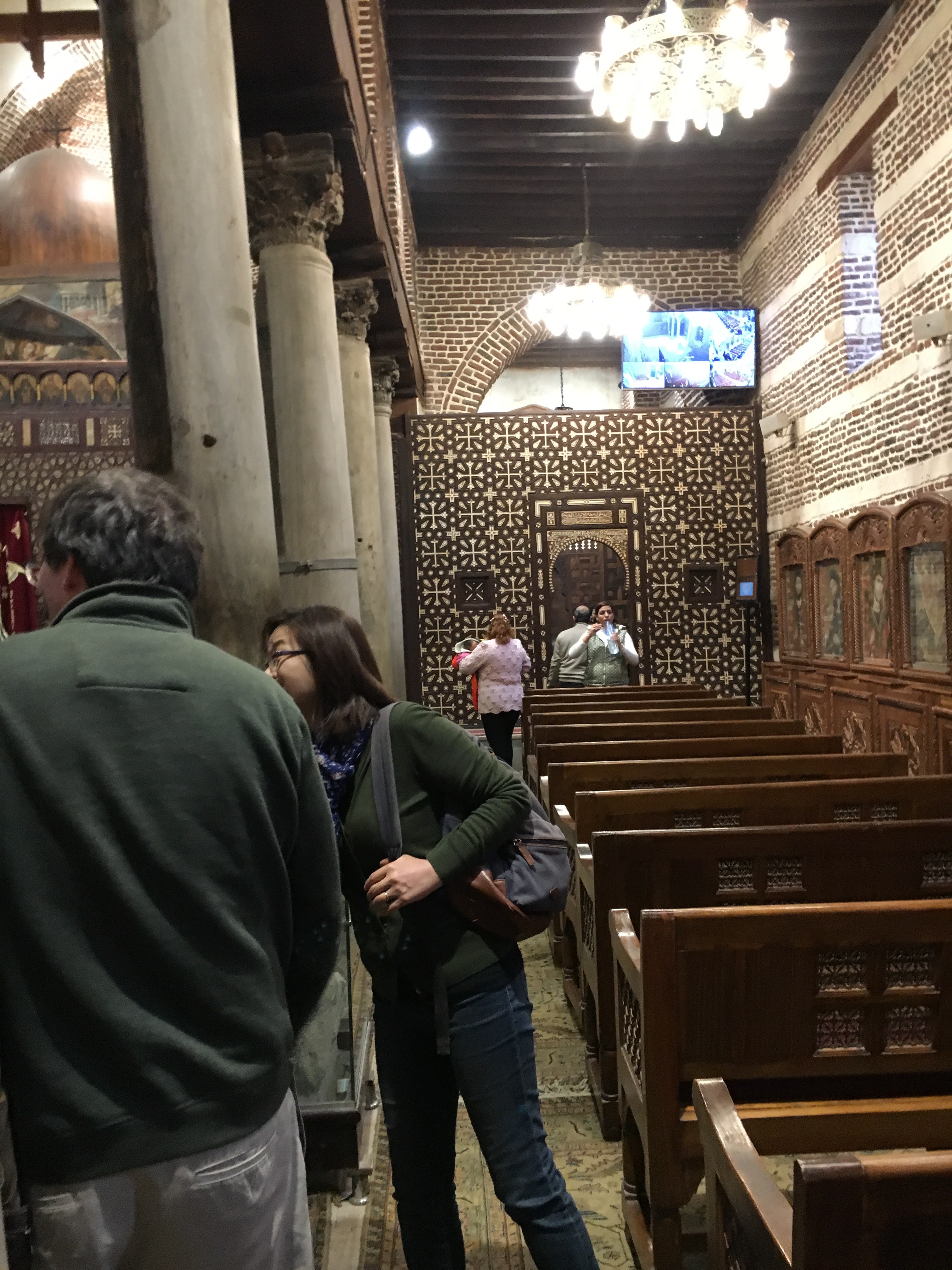 Now the Hanging Church is a popular destination for tourists, believe it or not. There are people milling around us. Coming and going. Admiring the icons on the walls. Probably imagining the fact that the Virgin Mary was actually here.